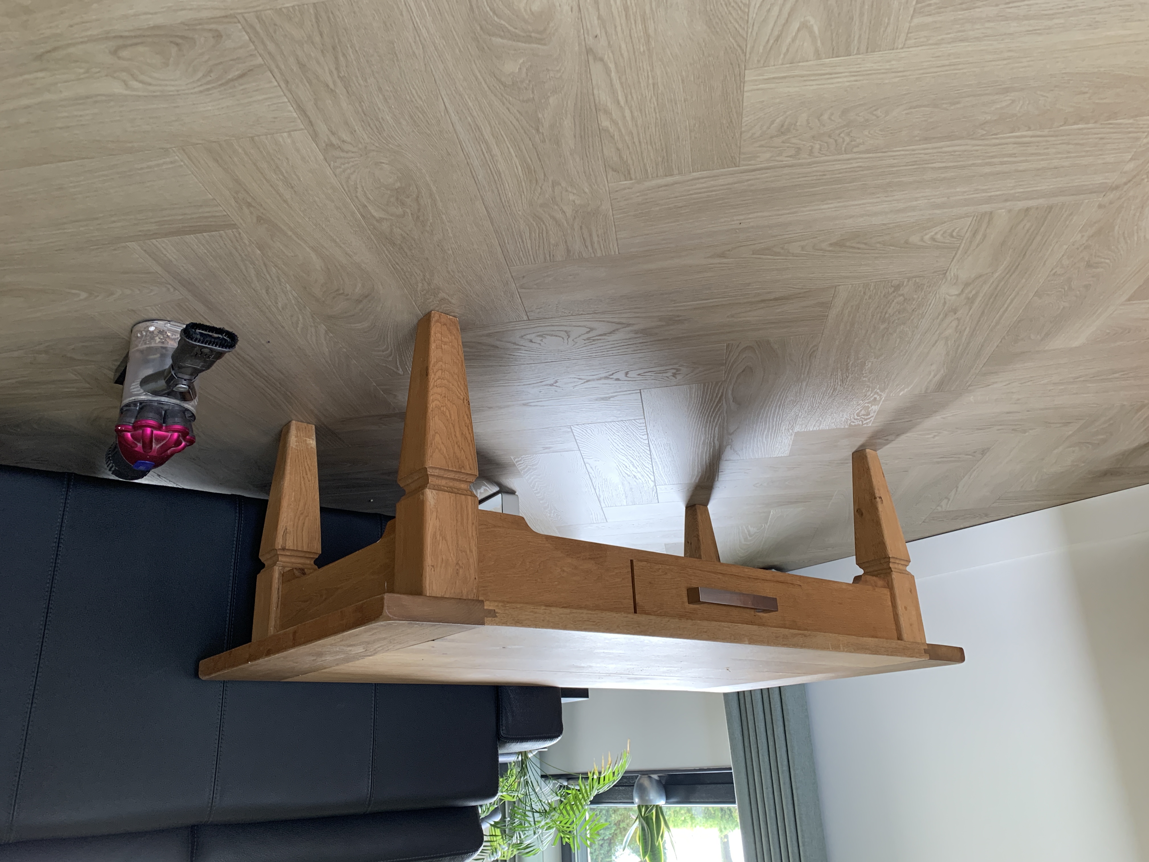 Opknappen van een eiken salontafel. De klant wilde deze oude tafel een wat strakker uiterlijk geven. De zijkanten zijn rechtgezaagd en de poten vervangen.